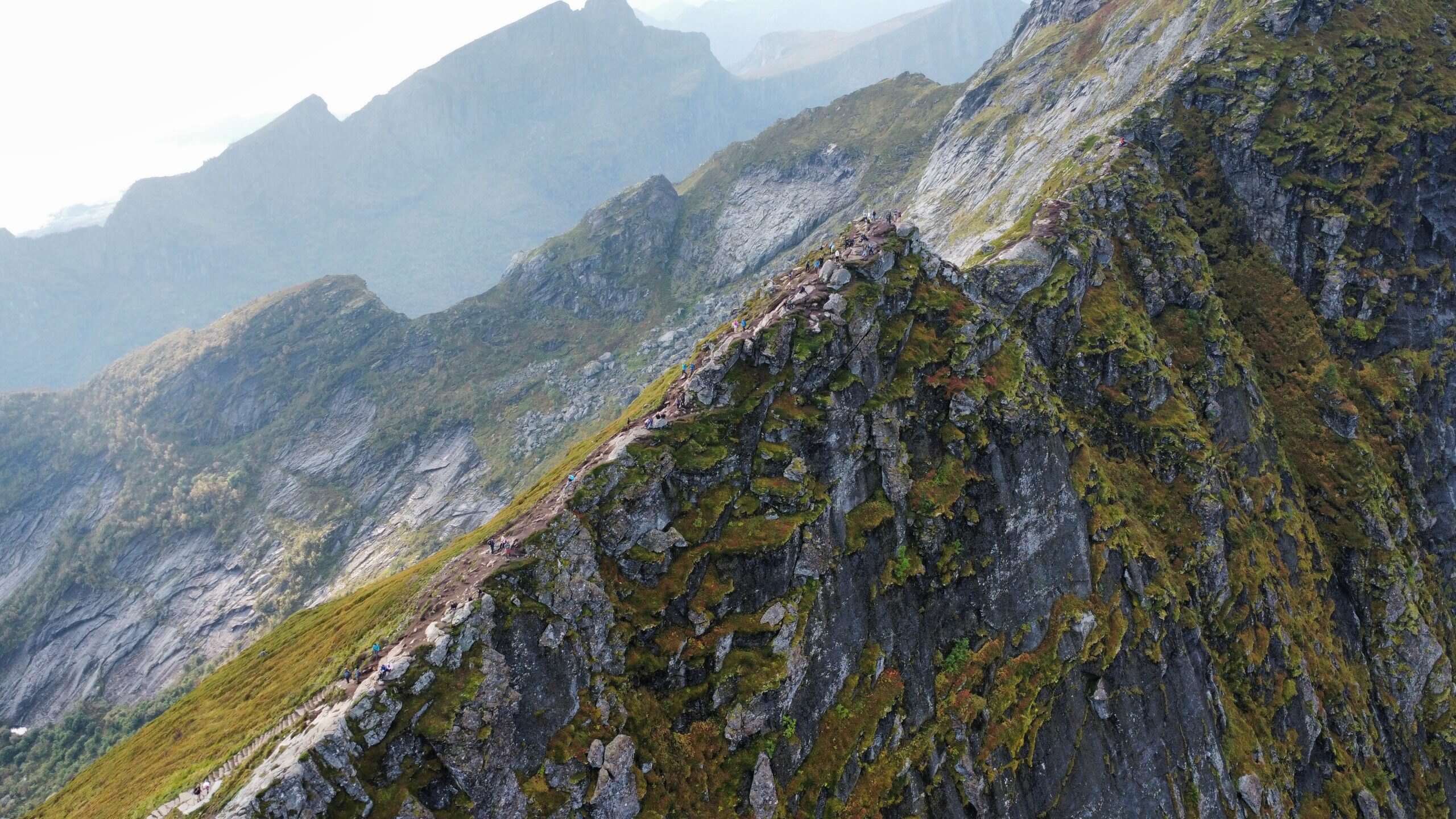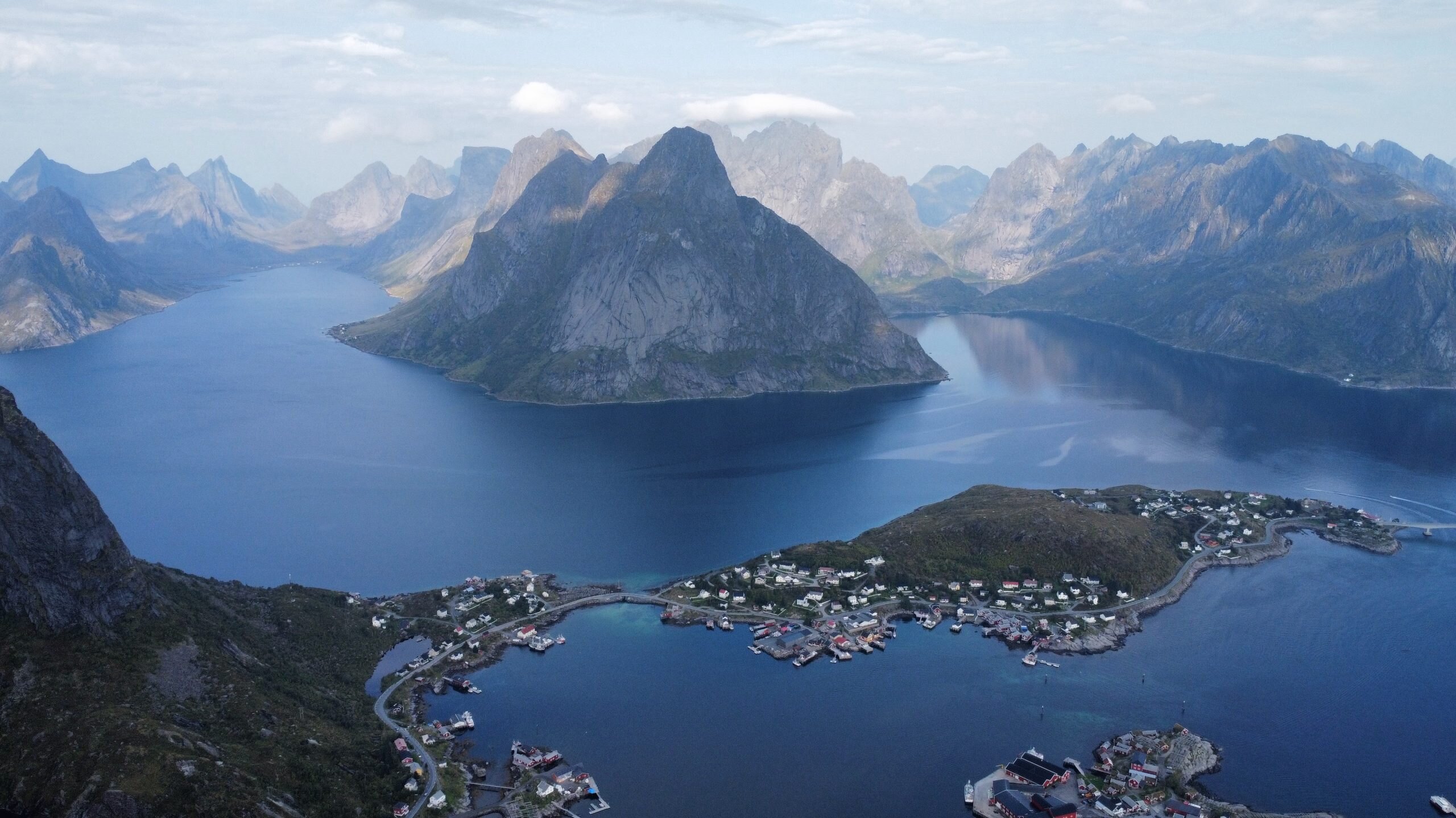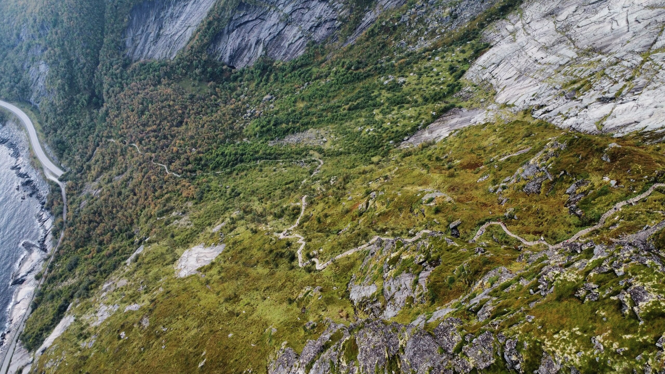 The next day we woke up early and packed our stuff to do one of the most beautiful hikes in Lofoten. From the parking spot in Reine you can start walking, crossing the town and getting to the trailhead. There, the hike officially starts: 1 km up only with 1978 steps and 448 m elevation gain. It's not very long but the fact that it's big steps all the time makes it tough. But the reward you get once you reach the top is worth the effort: an astonishing view of the fjords, Reine, and the E10 road with its famous bridges that connect all the islands.